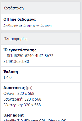 Η διαχείριση της offline λειτουργίας της εφαρμογής γίνεται μόνο εφόσον έχει προηγηθεί η εγκατάσταση (προσθήκη εικονιδίου). Αλλιώς εμφανίζεται σχετικό μήνυμα.